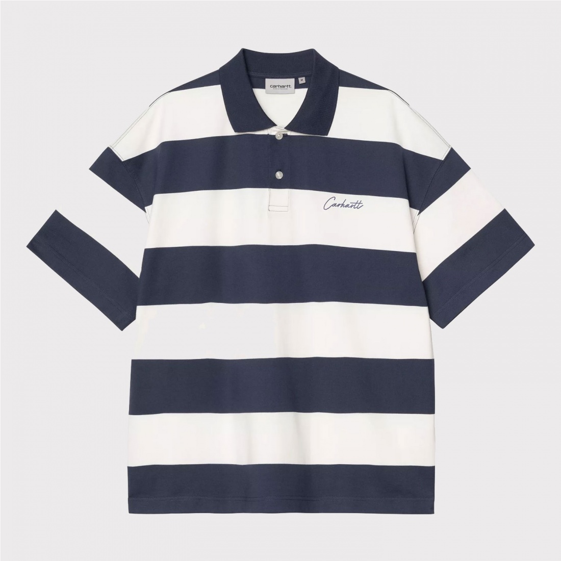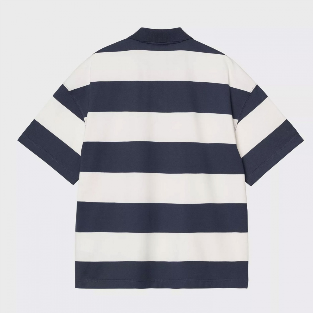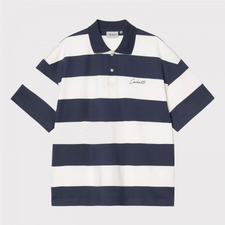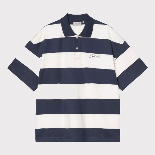 El S/S Delray Polo, de corte holgado y boxy, está confeccionado en punto de algodón orgánico de peso medio y presenta un estampado de rayas. Tiene cuello y media tapeta con botones. El pecho está adornado con un bordado gráfico.
