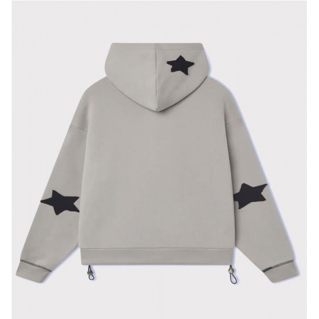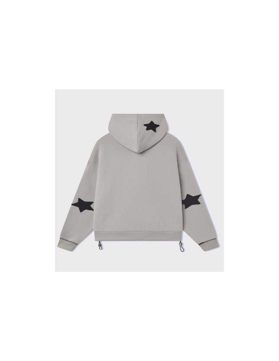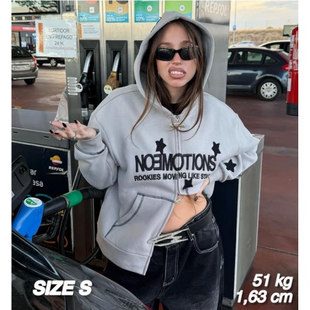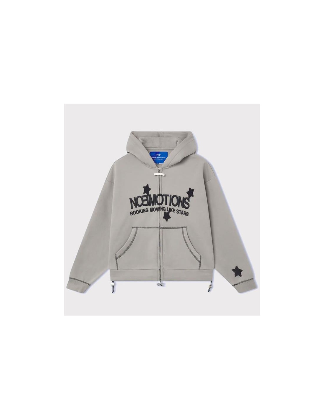 Doble cremallera. Detalles personalizados. Boxy Fit. Siete estrellas aplicadas. Logotipo frontal bordado. Costuras en contraste en bolsillos y mangas.