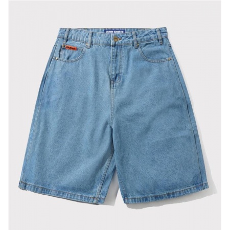 Shorts vaqueros holgados 100 % algodón Costuras doradas en contraste Etiqueta tejida en el bolsillo para monedas y el bolsillo trasero Parche de PU en la cinturilla Trasbillas con cordón interior en la cinturilla