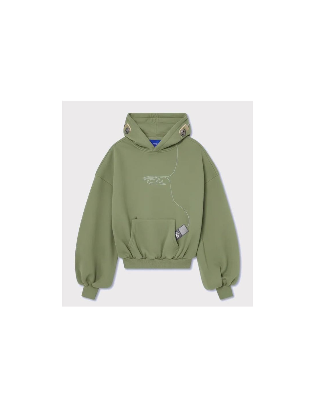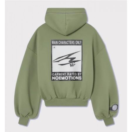 Confeccionada en 100 % algodón. Gráfico minimalista de líneas en la parte delantera con efecto bordado tonal.Corte oversize corto con mangas globo y bajo elástico. Puños acanalados para una silueta estructurada. Parche gráfico grande en la espalda con la leyenda "MAIN CHARACTERS ONLY – GARMENT RATED BY NOEMOTIONS" y efecto desgastado.