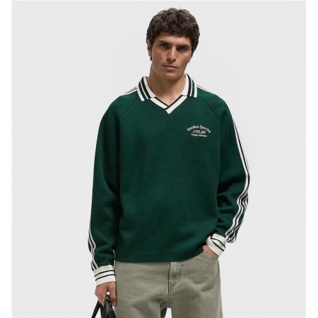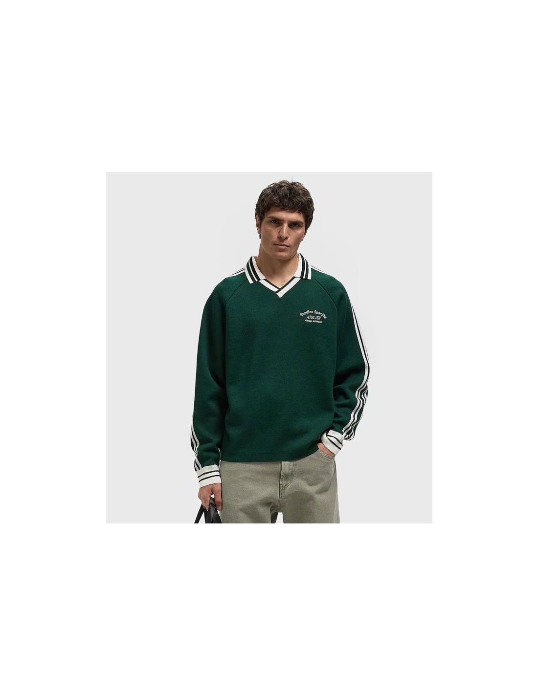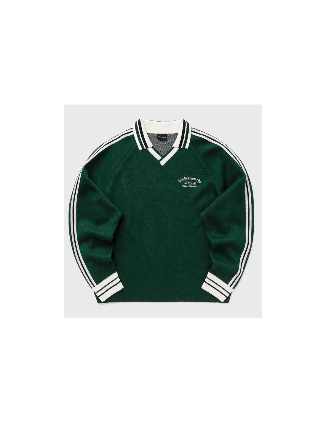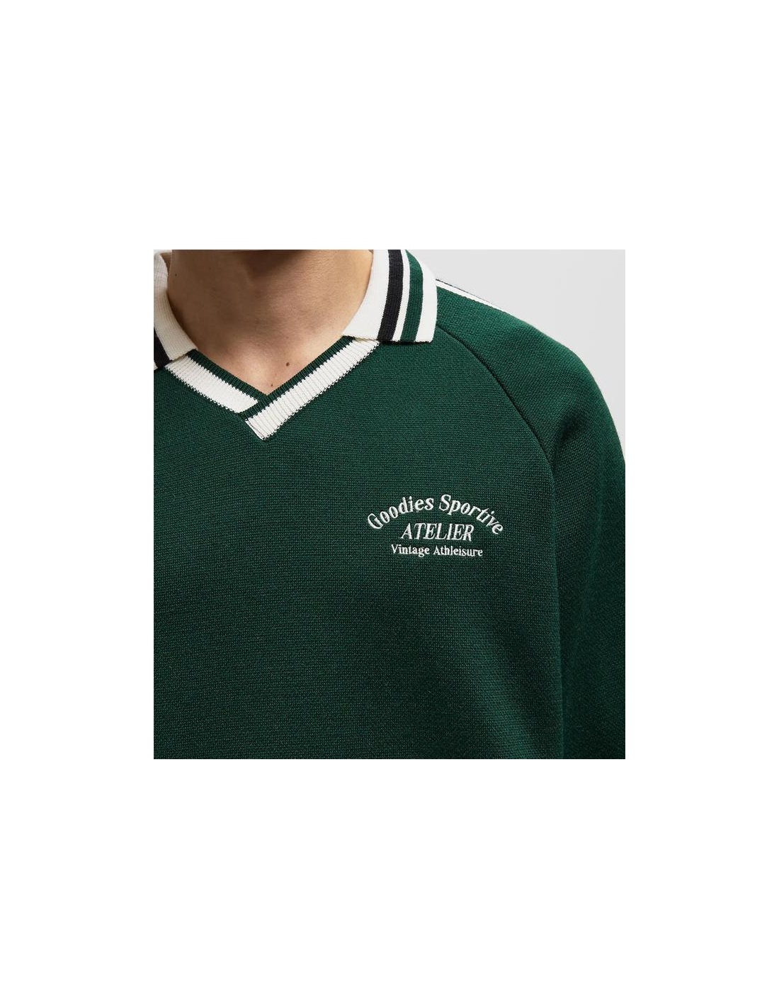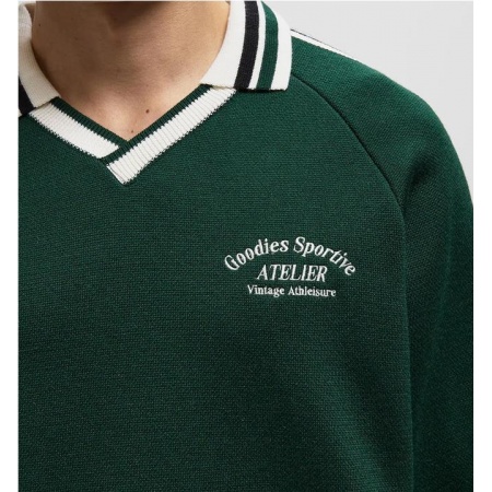 El polo Olive de Goodies Sportive combina el encanto vintage con el minimalismo moderno. En un verde intenso con rayas negras y un elegante cuello en V, aporta un toque informal y sofisticado a cualquier look.